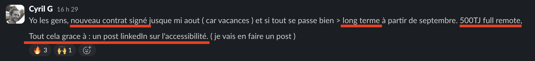"Hello Nicolas, petit message rapide pour te dire que j'ai eu la validation de la mission! TJM:510€. Je commence le 22, mais je vais voir si je peux commencer le 29. C'est tout bon! Je n'en reviens toujours pas, mais là, c'est du concret 🎉🍾🥂🎊. Encore "merci", mais vraiment "merci" 🙏 J'espère te voir en Thaïlande... sinon à Paris en Porsche! 🤩 D'ici là prends soin de toi et de ta femme! 🙏"
